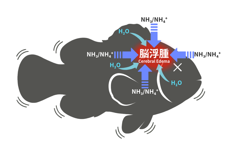 その結果、本来であれば排出されるはずのNH₄⁺によって、浸透圧調整やイオンバランスの崩壊を一気に加速させます。