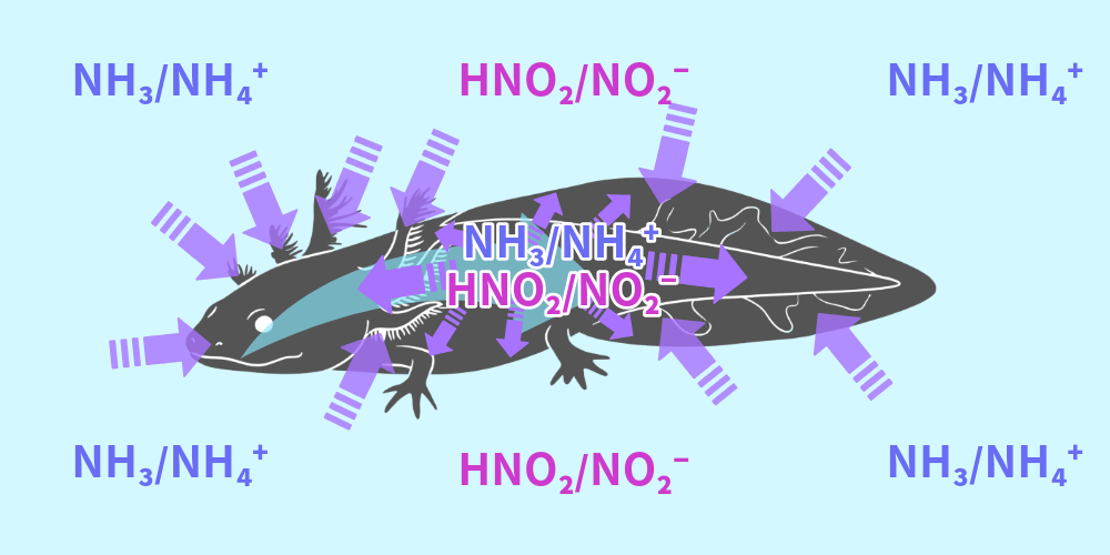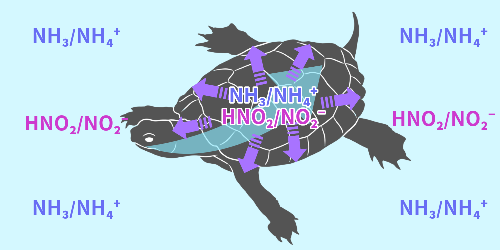 ※水質の酸性化を抑えるためにカキ殻などを入れている場合、pHの上昇により粘膜腐蝕作用のあるNH₃の割合が増えます。また、表皮からの吸収はほとんどありませんが、飼育水にアンモニアや亜硝酸が大量に含まれている場合、これを「飲み水」として摂取することで消化器官から一気に吸収し、急性中毒に陥ってしまう可能性があります。
