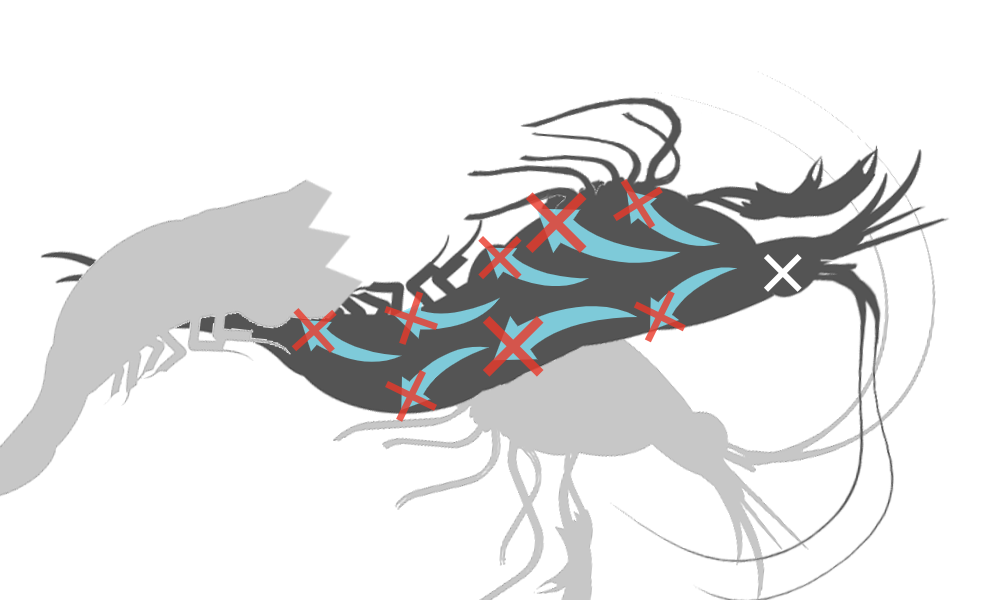 甲殻類が脱皮をして殻を脱ぎ捨てる際、体内に大量の水を取り込み、その圧力(膨圧)を利用して内側から古い殻を割る必要があります。 しかし、アンモニアによって浸透圧調整が正常に働かず、適切な水分調整ができなくなると、体を膨らませるための十分な圧力を生み出せなくなります。