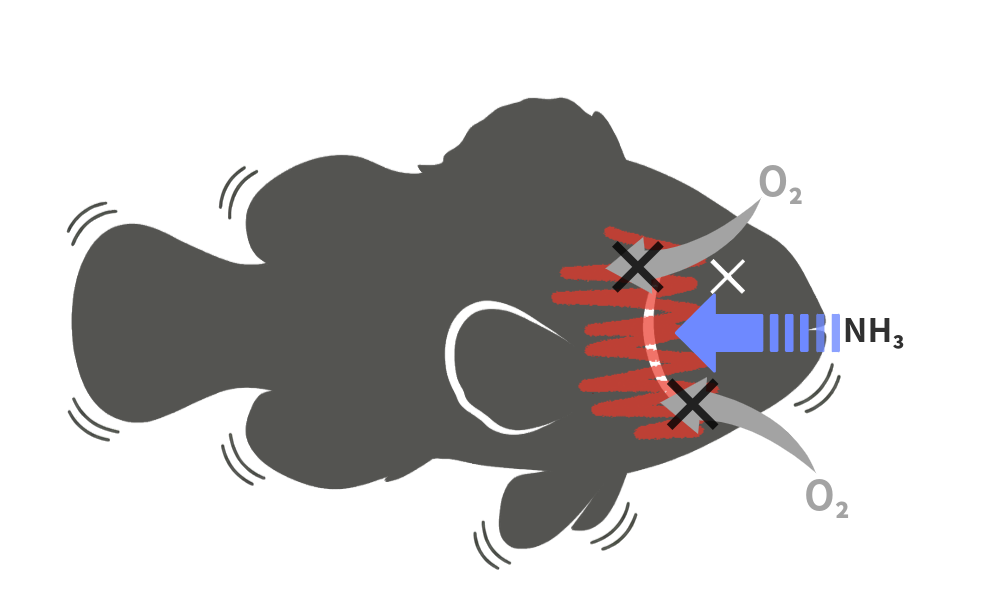 高濃度のアンモニアは、脳へのダメージに加え、エラなどの粘膜組織に対して化学熱傷(やけど)のようなダメージを負わせます。