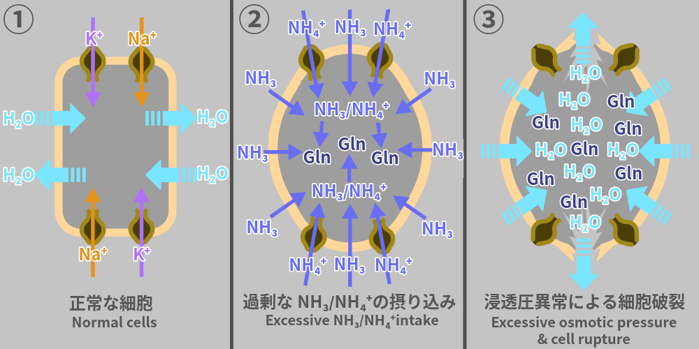 しかし、アンモニア濃度が高すぎると、このグルタミンが細胞内に過剰蓄積します。