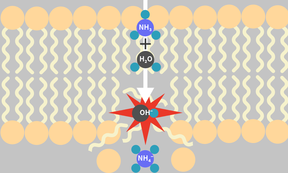 NH₃はアルカリ性であり、細胞膜を通過する際に膜の主成分である脂質と反応し、「鹸化(けんか)」と呼ばれる現象を引き起こします。 これは石鹸が油汚れを溶かすのと同じ原理です。