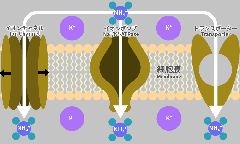 そのため、細胞膜にある「カリウムを取り込むためのポンプ(Na⁺/K⁺-ATPase)」が、本来取り込むべきK⁺と間違えて、形状の似たNH₄⁺を体内に取り込んでしまう「拮抗阻害」が発生します。