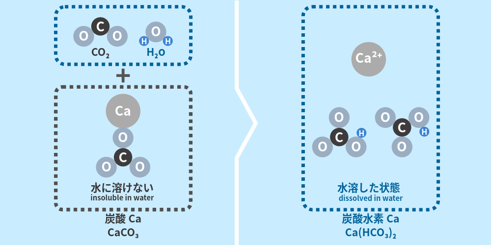 炭酸カルシウムには結晶構造が異なるいくつかの種類があり、それぞれ水への溶けやすさ(溶解率)など、性質に違いがあります。その中でもアラゴナイトは、水に溶けたCO₂と反応しやすく、水への溶解率が高い特徴があります。
